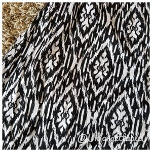 Black and White low v cut belted dress in size small by DEB. Super soft cotton! Not too short. The pattern like a damask or ikat print. Would likley fit sizes 2-6. Very stretchy. Belt is adjustable. It fits the manikin well, so I included the manikin measurements as well for your reference and to compare. Note: I small hole in the back by the tag (see pic #2 collage). Visible to the eye, unless hair is longer.