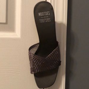 Low heel sandals with pewter mesh like upper. Never worn! Small area on foot bed where tag was peeled off and left a different color.