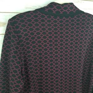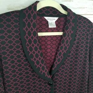 Exclusively Misook burgundy and black circle print button front blazer. Comes with shoulder pads.