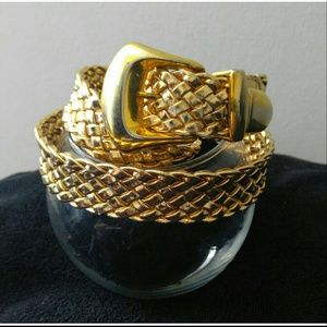 Day Lor gold faux leather braided belt. Buckle is a little tarnish but overall excellent condition. 40" total length