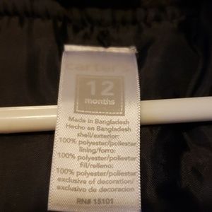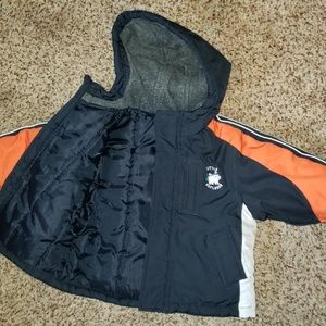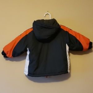 Adorable little explorer winter hooded coat. Navy with white & orange accents/stripes. Embroidered polar bear/mountain/tree graphic on left chest pocket. Great condition! Only worn a few times. Soft gray plush lines hood to keep your little one cozy & warm!