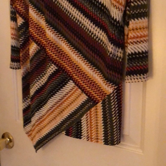 This is a brand new tunic. Colors are brown,gold,black, beige, red, and green. Absolutely beautiful. This tunic has never been worn. Still has the tags. Ready to wear. It is polyester and spandex. Smoke free and pet free home.