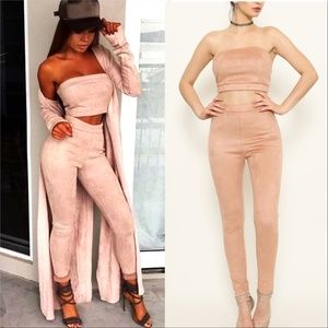 This sassy dusty pink soft faux suede pant & top set is so sassy yet comfortable! As seen on celebrity's this has been paired with long dusters or oversized denim jackets. The top is strapless & the bottoms are a skinny fit.