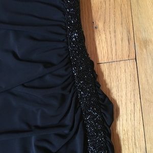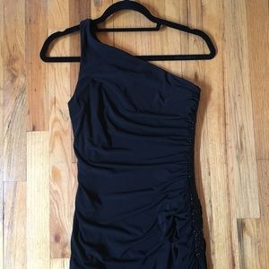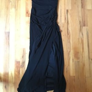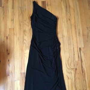 Beautiful black evening dress! This is one shoulder, floor length and has a slit up the one side and simple beading.