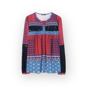 Desigual ๐ Mona Fucsias Boho Lace Sleeve Printed Button Down Shirt ๐ Blue Pink