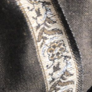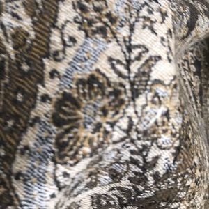 Lovely and timeless. This scarf is a tan, gold and khaki green color. It has reversible prints with a floral-pattern border and black, khaki and golden fringes that hang from both ends. Can be worn as a scarf or a wrap. Length is approximately 70”. Excellent condition, no visible signs of wear.
