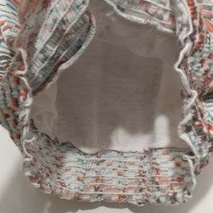 Soft & comfy. Two layer tank. Orange, blue, browns & cream. Stretchy band on bottom. Size small to medium. Very stretchy. Scrunchy razor back style. Top layer is thin sweater like fabric. Hope it fits & thx 4 stoppin by. ✌&❤🌼