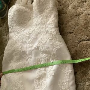 One of most beloved styles in Enzoan history. Timeless and contemporary at the same time, Dakota features a universal flattering intricate tool in lace overlay in an ultra chic mermaid silhouette. And with exquisitely scalloped him lace and a soft strapless neckline the full length gown is fit for any Brado dream skate from a fairytale garden celebration to a gorgeous beach destination wedding. Normal wear at bottom of dress.