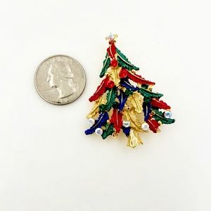 2/ $25 Gold Tone Rhinestone Enamel Christmas Tree Pin. Such sparkle and shine on this adorable Christmas Tree Pin. Gold tone with green, red and blue enamel and shiny rhinestones. Pin measures 2 1/8" H x 1 5/8" W. The pin is in excellent condition. All stones intact and pin back is in working order.