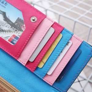 This long wallet has the words ‘Don’t Touch This’ scrawled across the front, with a green cactus. It has a snap closure, multiple slots for cards, a clear plastic ID slot, 2 sections for cash and checkbook, and a zippered pocket for coins. This is large enough to hold a small cell phone (example: iPhone 6,7,8,X), keys and a lipstick.