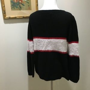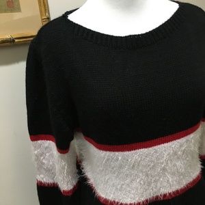 This oversized sweater from BooHoo is black with a furry white stripe lined in red. It's very comfy, thick and soft.
