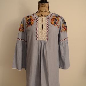 Eye catching embroidery detailing and print adding color and life to dress. Never before worn dress in perfect condition waiting for a new owner. Perfectly paired with a statement show, purse, or jewelry. Can cinch in the waist line with a belt.