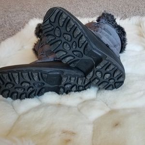 A subtle print, faux fur lining, and embossed lacing graphics add femininity to this techy snow boot.