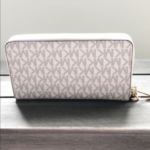 Gold hardware with detachable wristlet strap and a compartment for your smartphone! Approximately 7x4 inches.