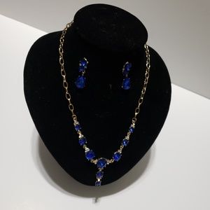 Blue Crystal Rhinestone Necklace With Drop Pendant Earrings Set