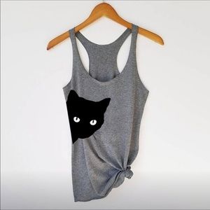 Super cute kitty tank top • Heathered Gray with black cat peeking around • Soft cotton material • Size Small, Medium & Large • NWOT • Small is 18” across bust, Medium is 19” across bust & Large is 20” across bust