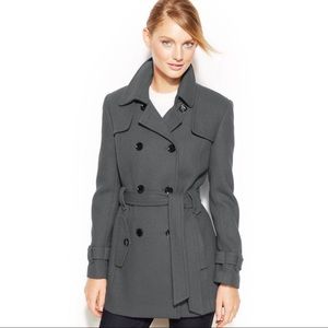 Calvin Klein Gray Double-Breasted Belted Wool-Blend Pea Coat, women’s US size L (large). Double breasted labels form plunging v-neck collar at front. Belt loops w matching wrap tie waist belt (adjustable; tie at your most comfortable fit!). Buttoned straps at cuffs. Button lined sleeve pockets (2, 1 at either hip). All black buttons. Fully lined. Excellent new condition; no damage or flaws. Originally $275.00 at Macy’s.com! Currently sold out in stores & online!