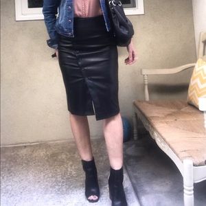 This midi faux leather skirt has such a perfect fit with good stretch! 🤩 Love the button detail that runs slightly asymmetrical to give it a modern feel. 🤩 Zipper back. 🌿 Wipe clean material 🤩