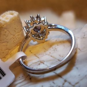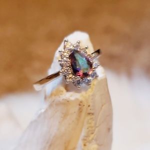 Beautiful genuine mystic topaz ring with white topaz accents. Size 6.75. Stones are set in a 925 silver plated band. Great gift for someone special! Comes in gift box/pouch.