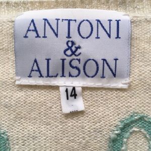 55% Silk, 45% Cashmere. Antoni & Alison, a small boutique design studio in London creates unique and playful pieces that are rare to find. This playful knit top is perfect for autumn as it can be layered and offers the warmth of cashmere and silk. The pom-pom tassels can hang down the back or be tied around the front for multiple options. A pair of jeans and booties completes the look! (UK size 14, equivalent to US size M. Would also fit a small or xs). Reasonable offers welcome.