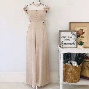 NWT Boho Off-The-Shoulder Smocked Jumpsuit. Brand new boho chic wide leg jumpsuit. Pale nude blush color with button front bodice & hidden snap, high stretch waist, & wide leg pants. Off the shoulder flutter elastic sleeve.