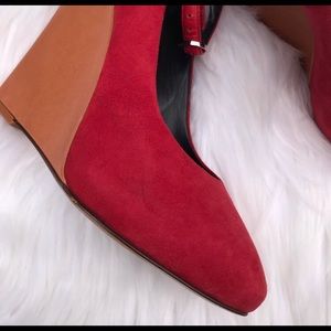 Red suede Celine round-toe wedges with concealed platforms, caramel leather covered wedges and buckle closure at ankles.
