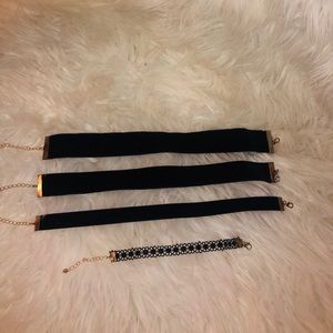 1 velvet choker chain necklace. 3 black velvet chokers(various widths) 1 bracelet. NEVER WORN