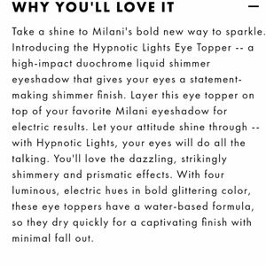 🌟Milani Hypnotic Lights Eye Topper🌟Shade "04 Star Light( Pink/ Gold)🌟A Must Have this Holiday Season!🌟Create a Show Stopping look with this Hypnotic Light Eyeshadow🌟A Liquid Eyeshadow 🌟Infused with Delicately Finely Cut Glitter that Creates a Shimmery look in Pink and Gold🌟A Wand Applicator allows you to apply this Stunning eyeshadow with Precision🌟Iridescent Shine, Enhances and Defines your Eyes🌟High Impact🌟Brand New🌟Factory Sealed🌟Free Gift Included🌟Fast Shipping🌟🌟🌟