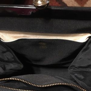 It has some discoloration on the gold and silver hardware on the front of the bag. It has a pocket and zipper inside and a snap closure.