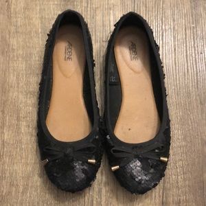 Ardene black sequence flats with a bow. Worn once for Christmas. Size 6. Perfect condition.
