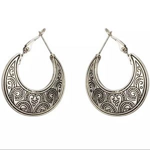 These antiqued silver toned boho style ethnic engraved pattern earrings measure 1 1/2” by 1 1/2”. Perfect to jazz up any outfit!