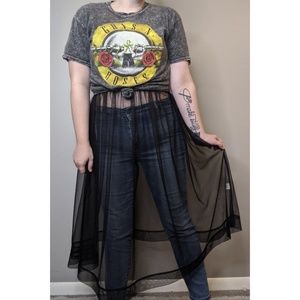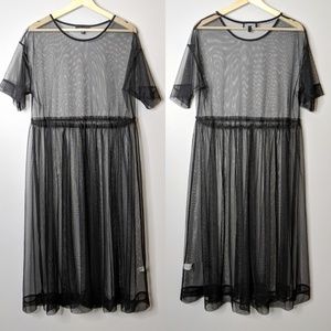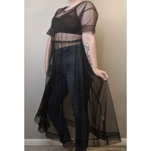 Pullover black tulle midi length dress. Sheer with gathered skirt and half sleeves. There are so many fun and unique ways to style this dress. Add it to your everyday wardrobe or even use it for a chic Halloween costume. Please keep in mind that this dress is very oversized so you may want to order a size down. Model is a size 16 and wearing a Large.