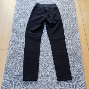 Pull on panel legging with elastic waistband. Vegan leather front panel and ponte in the back.