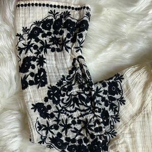Cream colored Free People tunic with black flower embroidery on the sleeves, size M, lightly used. This is Free People for Urban Outfitters. No rips, stains, or tears, there is one tiny hole on the right sleeve under one of the black flowers that is not noticeable (pictured).