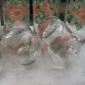 Set of 7 Imperial Glass tumblers from 1940s/50s. Clear glass, hand painted with a floral design that goes all the way around. Made by Imperial Glass Co. in Bellaire, Ohio. Smooth, rounded bottoms. Design called "Prairie Rose", pink flowers with yellow centers/buds. Green leaves. 4 3/4 inches high. Opening diameter about 2 3/4 inches. Very good condition - no chips or cracks. Painted design is intact. Have been sitting in a curio cabinet for years. Great for collectors of Imperial Glass items.