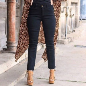 L and B solid black jeans, unhemmed around ankles. Comfortable, stretchy fabric that is sure to hug in all the right places. Flared. True to size.