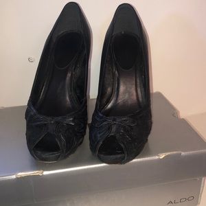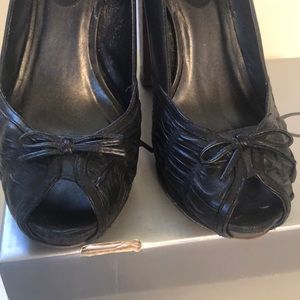 These are super cute and easy to wear. 5” heel 1” platform Peep toe with cute bow detail