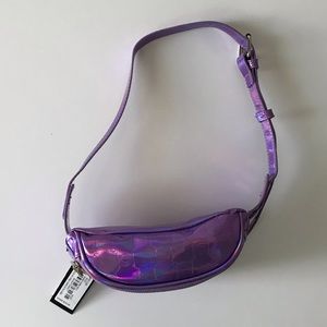 The compact silhouette of this petite fanny pack makes it the perfect hands-free accessory. Repeating embossed logo pattern with pyramid studs for edgy style.