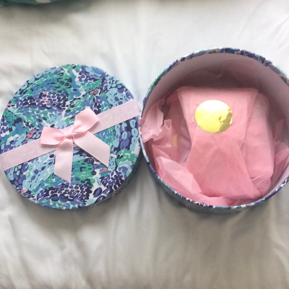 Set Includes: Round Printed Box With Hair Bow, Trinket Dish,And Earrings.
