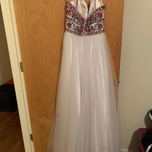 White prom dress. Size 4. Only worn once. Altered to fit 5’4 with about 5 inch heels and still had length. Paid over $600 with alterations. Brand is Mori Lee by Madeline Gardner.