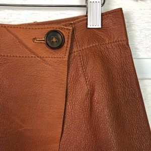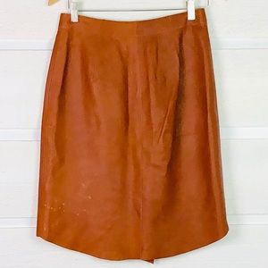 Buckskin colored suede leather in a great little two-button wrap skirt. Perfect fall wear! There is some distressing on the back bottom of skirt that could possibly improved with professional leather care. Price has been greatly reduced due to this imperfection.