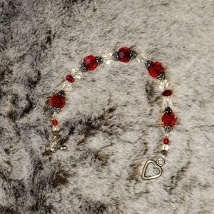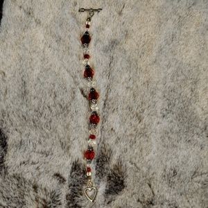 Red & clear Crystal & glass with a heart toggle clasp. Comes in a silver organza pouch ready to gift or keep for yourself.