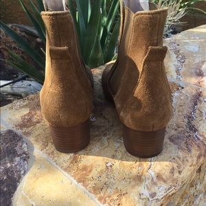 Suede Ankle Chelseasea Bootie in a Camel Color with a hint of Rust, Pull on with expandable Ankle panels.