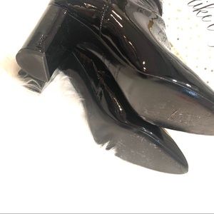 black patent leather high ankle boots. a mid high block heel
