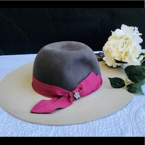 Colors: Dark Mauve/ Gray with rose ribbon and a light tan floppy brim.