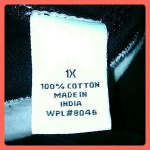 Black, 100% cotton, low maintenance blouse features white mock cami at V-neck and hem. The V is embellished with 1" beadwork. Very Good Condition.