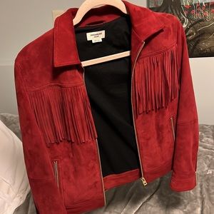 Red suede jacket with fringe. Only worn a couple of times. Light coat but keeps you warm!