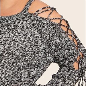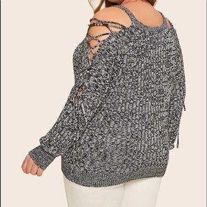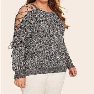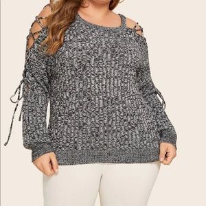 Plus black white lace up sleeve open shoulder marled sweater - 100% Acrylic
