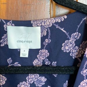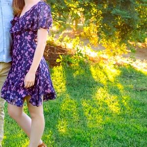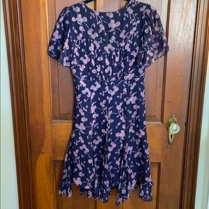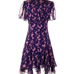 100% silk. A line with side zip. V with front bow can be tied or untied. Navy with pink floral design. Hits at mid thigh with flowing skirt. 31” chest, 37” length. Like new!
