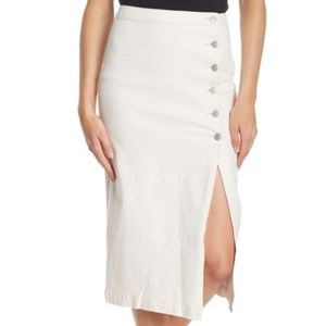A lengthy denim styled midi skirt with an exposed buttoned front and slit is the perfect way to stay comfy yet stylish on a casual outing.